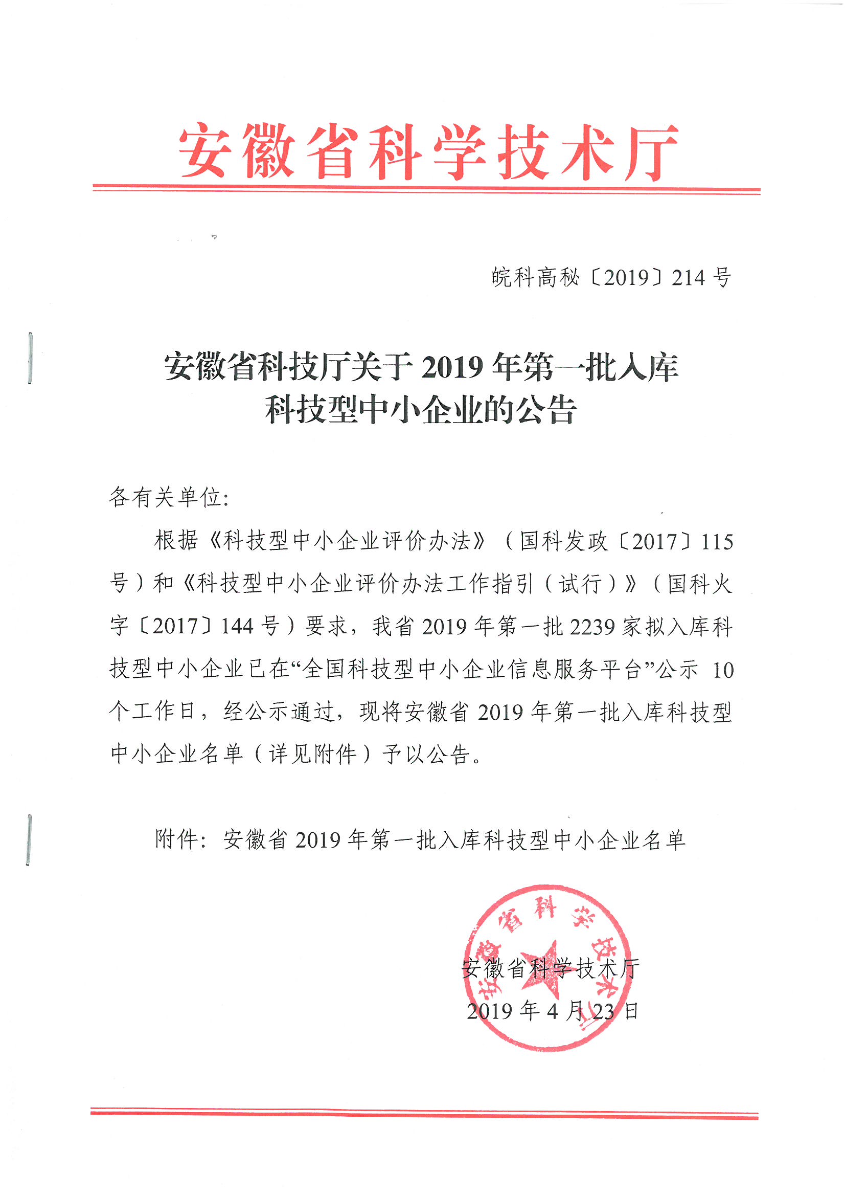 安徽省2019年第一批入庫科技型中小企業(yè)名單公告